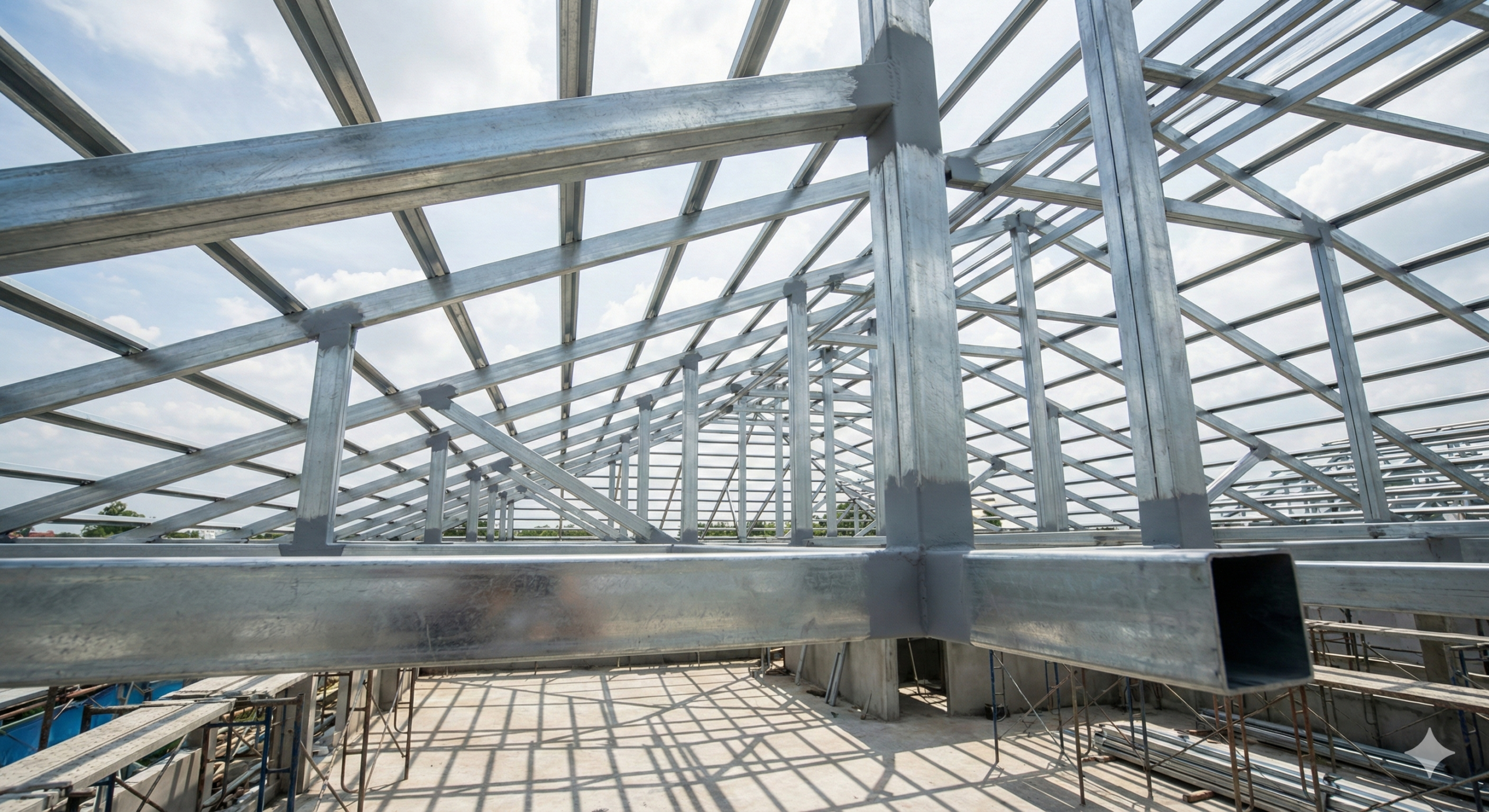 Khung kèo sắt hộp: Sắt mạ kẽm Hòa Phát loại dày (1.4ly, 1.8ly). Sử dụng sắt hộp 4×8, 5×10 hoặc đi kèo I, kèo V cho nhà xưởng rộng.